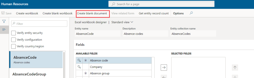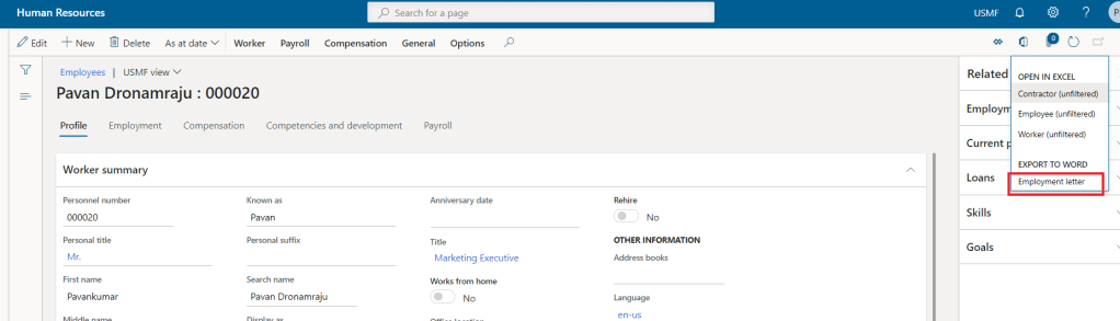 - Since you need to generate the document in the same way you would do export to excel, hence the template should contain the data with root entity only. Example: In worker form, if you want to generate the template based on a selected record, then the root entity should be either worker or employment entity. If the root entity is different, then you cannot see the template option under export to word.