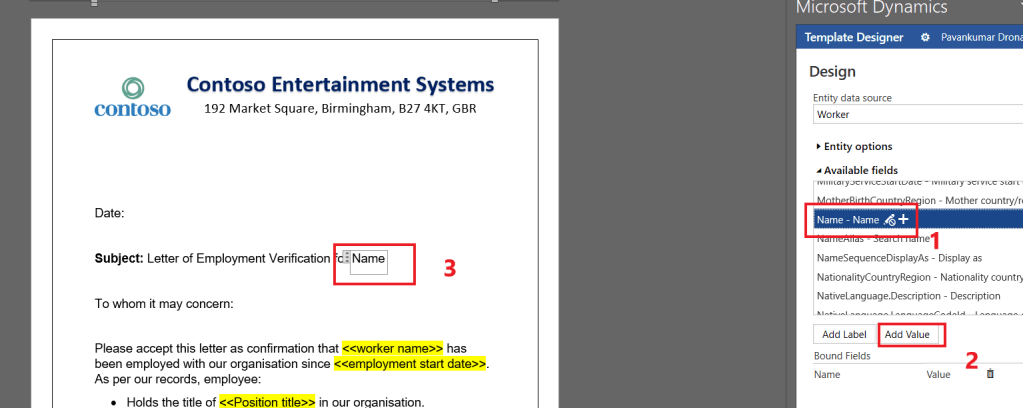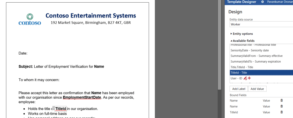 - We cannot write any joint logic between two entities and hence we cannot make the template to a dynamic document. For example, we cannot display the legal entity’s full name as we can get only short code from the employment entity (ex: we can display “USMF” but not “constoso Entertainment systems”). Another example, system date cannot be added. So for certain details, you cannot rely on data entities. Some needs to be static.