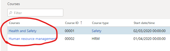 This feature is made mandatory by Microsoft. Before this feature exists in D365 HR, the hyperlink to open any record was always pointed out to first column only. In the below example, CourseID is the link to open detailed record. After you move the column, Course type became the main hyperlink record to open it.