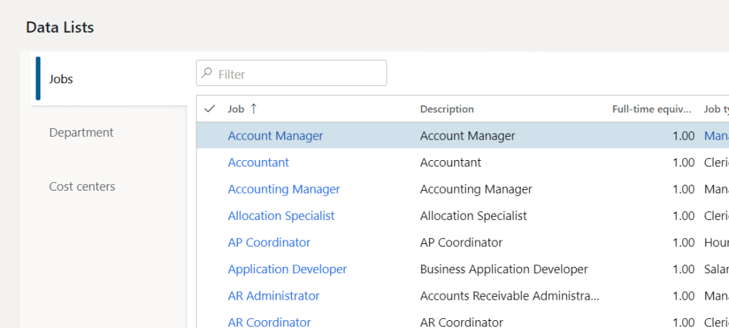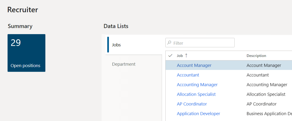Refresh the Recruiter workspace, you can now see the custom list page for jobs. Similarly, you can add more list pages if you want. Here I have added departments and cost centers too.