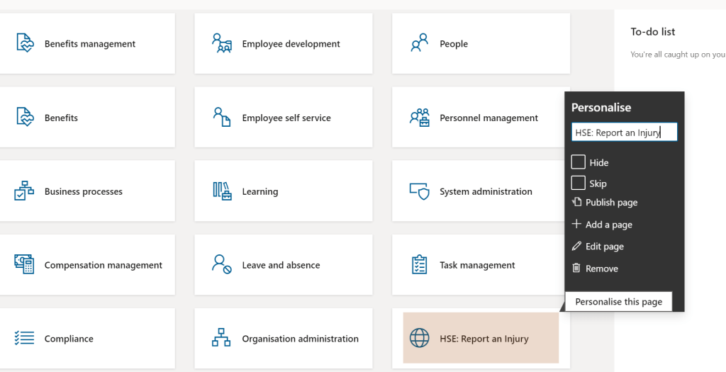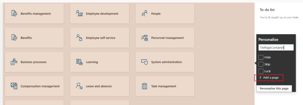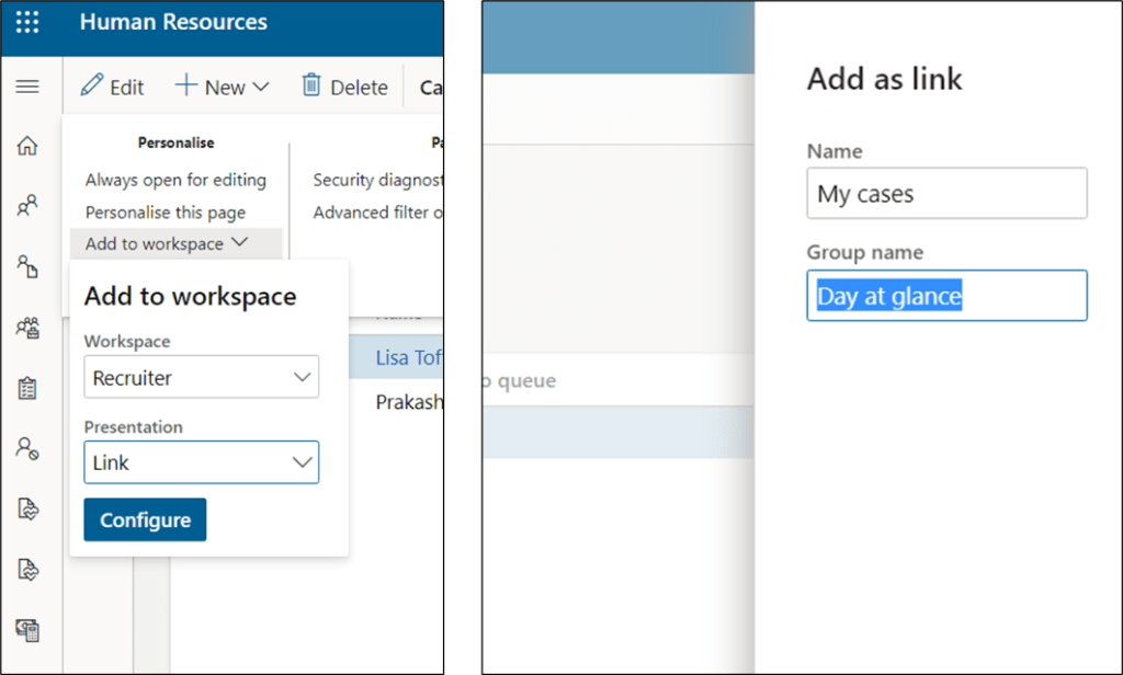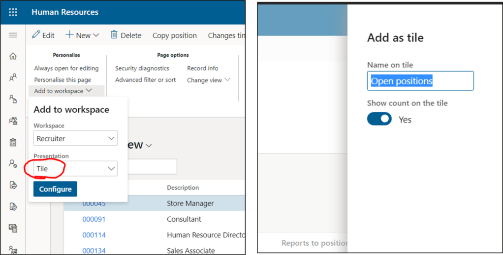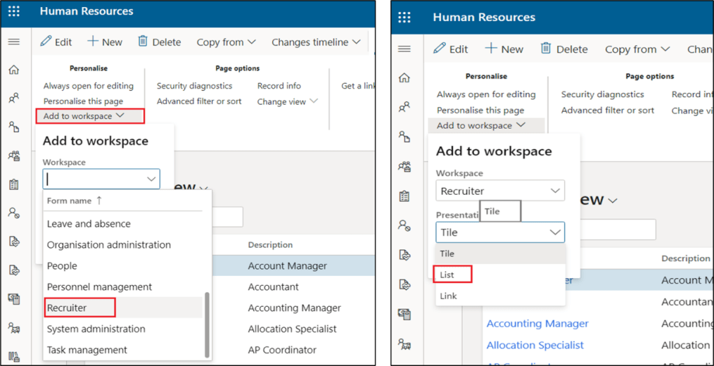 We can create a role specific workspace. Example, we can create a workspace for recruiter or business support personnel where they can their day to day activities in D365 HR.