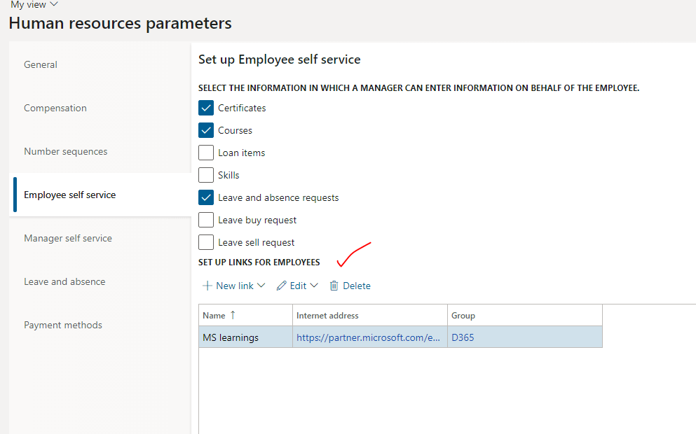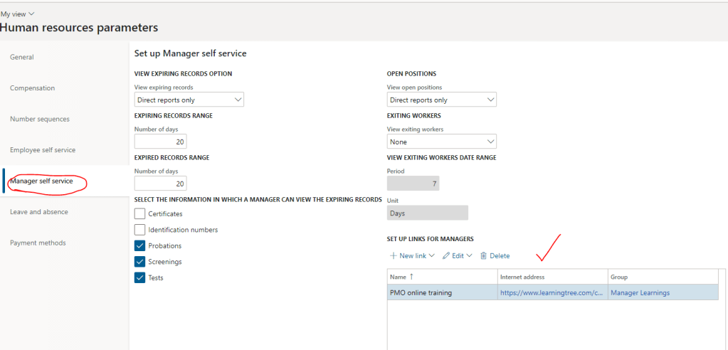 Once this is enabled, you can now go to HR parameters and can define custom links under manager self-service as shown below: