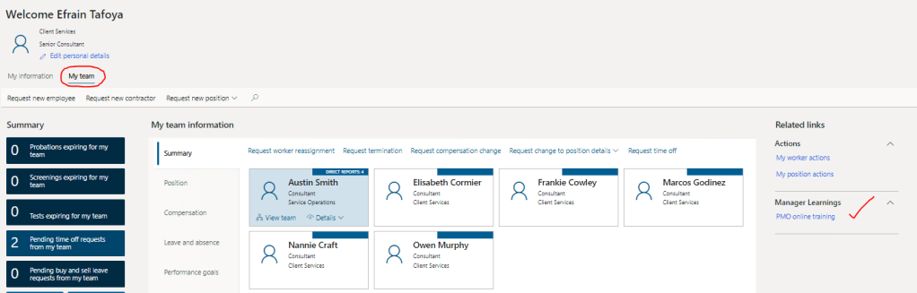 Now if you go back to ESS and to the My team section, you can see the custom links we configured under Related links as shown below: